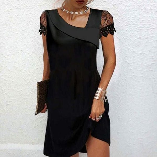 This simple black mini dress features lace short sleeves and an asymmetrical neckline, giving it the perfect fusion of classic meets unique style. Finish your look with heels or flats for a night out. Pair it with a blazer for a dressy moment.
