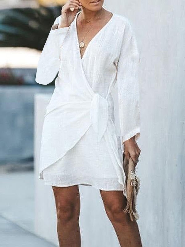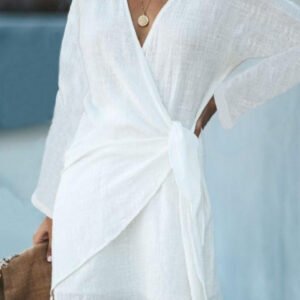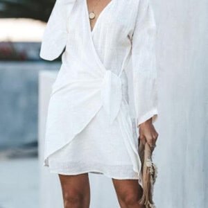 Refresh your summer?beach wardrobe with this lightweight mini dress, and turn up the heat everywhere you go. The billowy long sleeves, tie side wrap, and short dress length give this elegant yet sultry dress the perfect balance of coverage and style. Finish your look with jewelry, flats/heels, and a clutch.?Machine wash normal with light colors or hand wash. Bleach if needed. May be hung up to dry or lay flat. Tumble dry with low heat. Light ironing if needed.